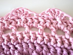 После того как будет связан коврик нужного вам размера, завершаем вязание по следующей схеме: одна воздушная петля подъема, 6 столбиков с накидом в третью петлю предыдущего ряда, полу столбик в шестую петлю предыдущего ряда. Далее идет повторение схемы до конца ряда.