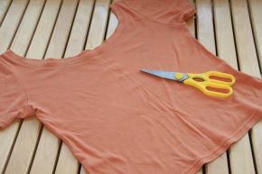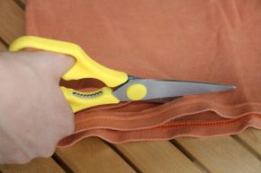 Начинаем изготовления пряжи с нарезания старой вещи на полоски шириной примерно 2 см. Делать это необходимо на ровной и твердой поверхности, например на столе. Сначала аккуратно отрезаем нижнюю часть футболки.