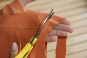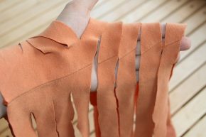 Отделив все полоски, необходимо сшить их в одну трикотажную нить.