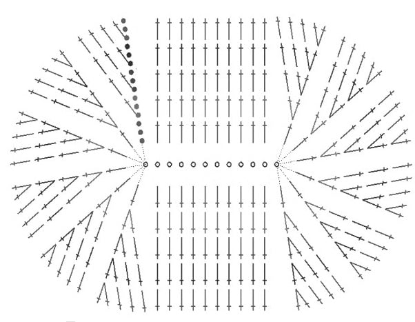 Важно! Чтобы изделие равномерно расширялось, нужно провязывать по 2 столбика с накидом в каждую четвертую петлю предыдущего ряда.